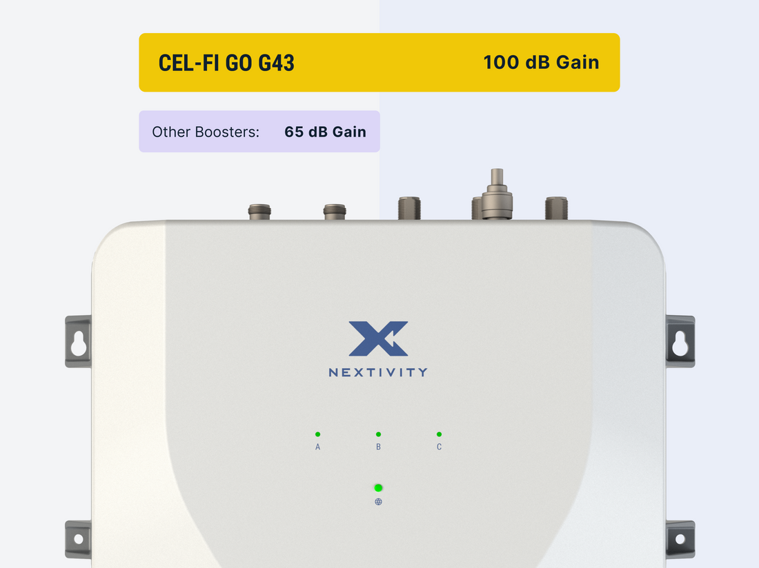 CEL-FI's GO G43 is the most powerful multi-carrier signal booster on the market, offering up to 100 dB of gain on Verizon, AT&T, and T-Mobile simultaneously.