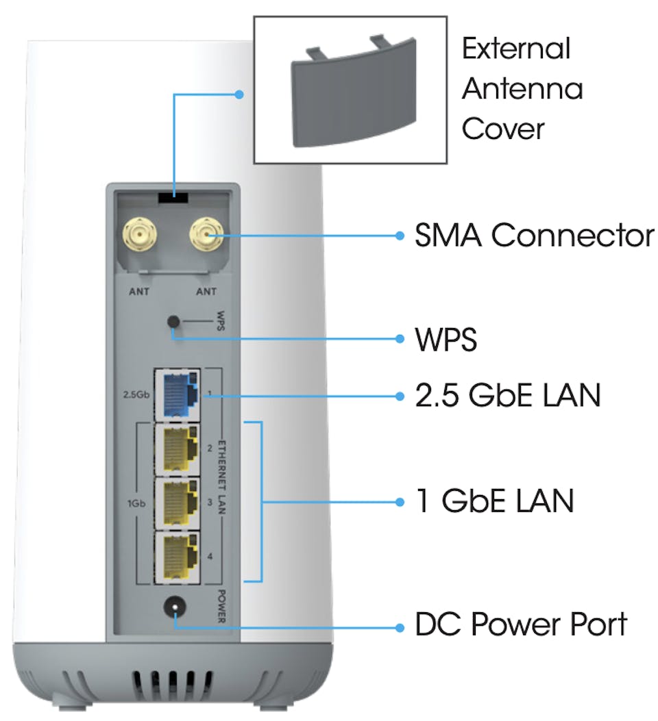 The AT&T Internet Air for Business 5G Gateway has two SMA ports for cellular on the back, which allow for a 2x2 MIMO antenna to be connected to the device.