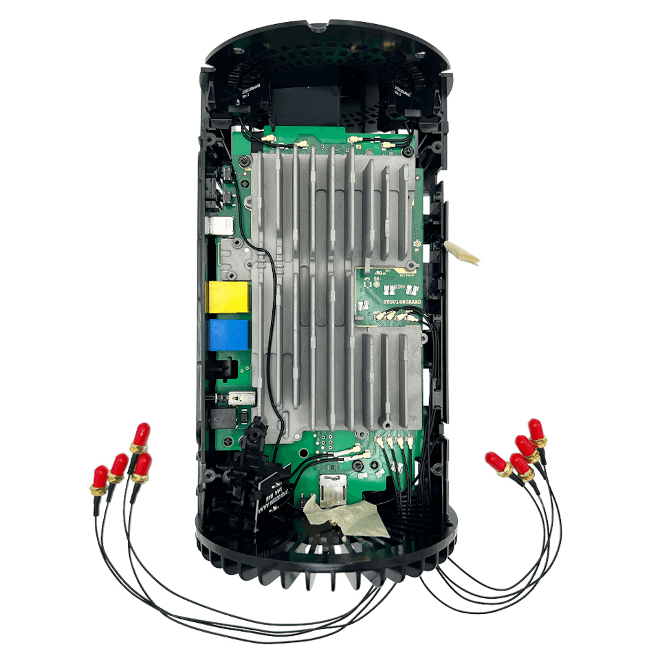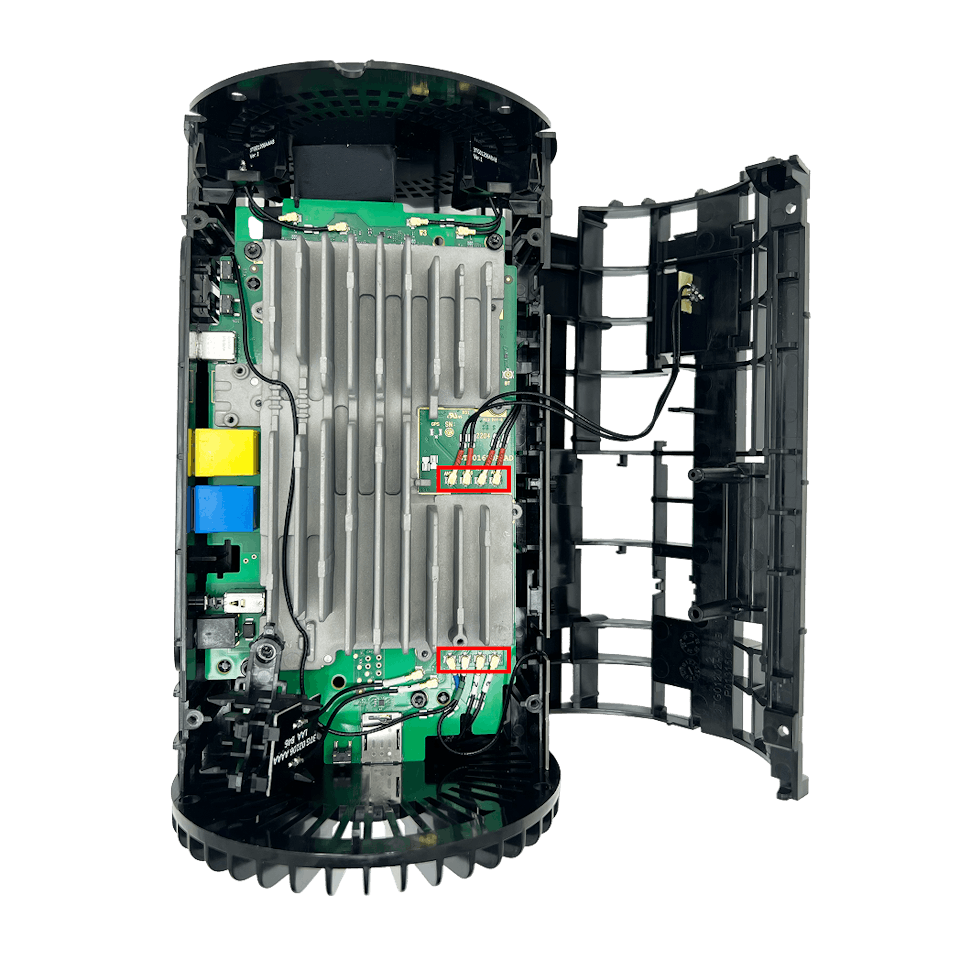 With the gateway fully reassembled, your eight SMA-labeled pigtail adapters should now protrude cleanly from the bottom vent area.