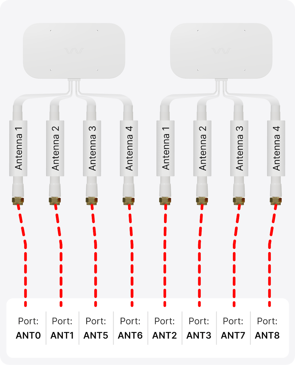 Step 9: Once all eight pigtails are connected, attach a small piece of tape to each SMA end and label it with the corresponding port number. This makes external antenna hookup much easier later.