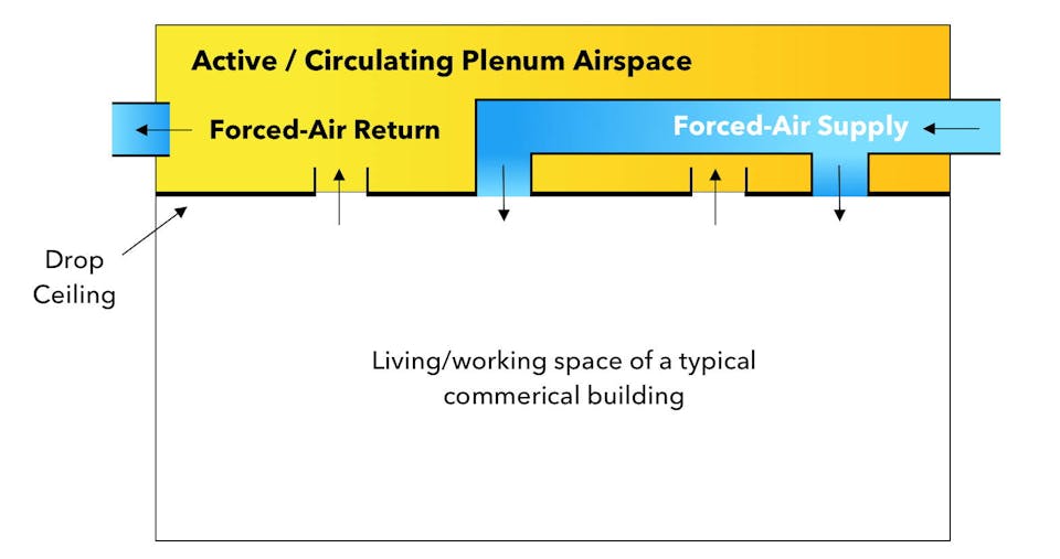 In most commercial buildings with HVAC systems, air ducts supply air from the external HVAC unit to the inside of the building, but the return air goes through the open space above the drop ceiling instead, making it a plenum space.
