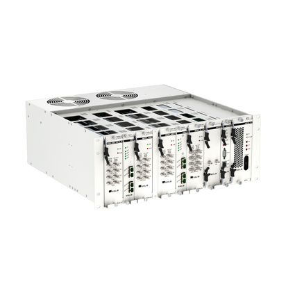 The compact 4RU head-end unit that powers the entire system, supporting up to sixteen carrier connections with built-in signal processing and automatic level control. Features modular design for easy future expansion.