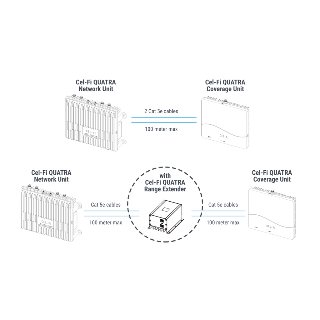 The Cel-Fi QUATRA 4000 Range Extender (QRE) is an expansion component in the QUATRA 4000 series that increases the maximum supported distance between the Network Unit and the Coverage Unit. This is especially useful in larger buildings, multi-building campuses, or installations where running RF over long coax isn't feasible. As a Power over Ethernet (PoE) device, it requires no additional power supply or external PoE injector, simplifying installation.