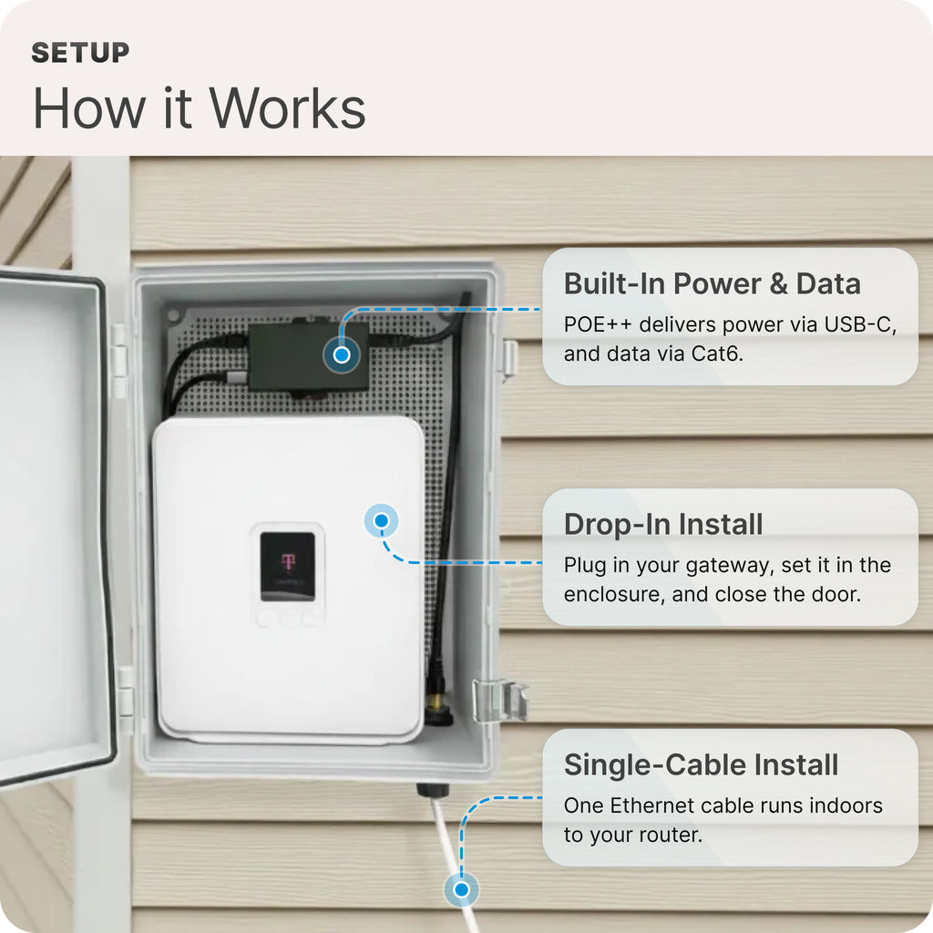 It’s designed as a straightforward, turn-key solution. Mount the enclosure outside, power the gateway using the pre-installed PoE-to-USB-C splitter, and run a single Ethernet cable indoors to your router. By placing the gateway where cellular signal is strongest, you can often achieve faster, more stable performance than any indoor placement allows.