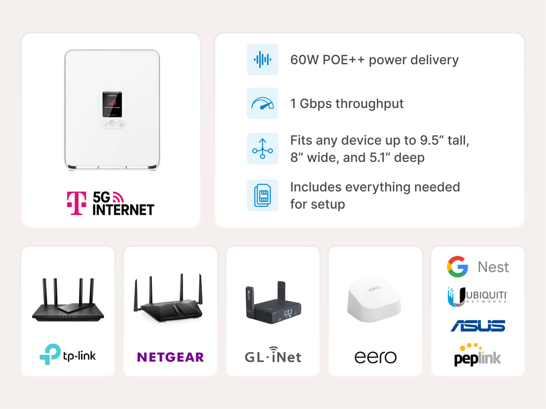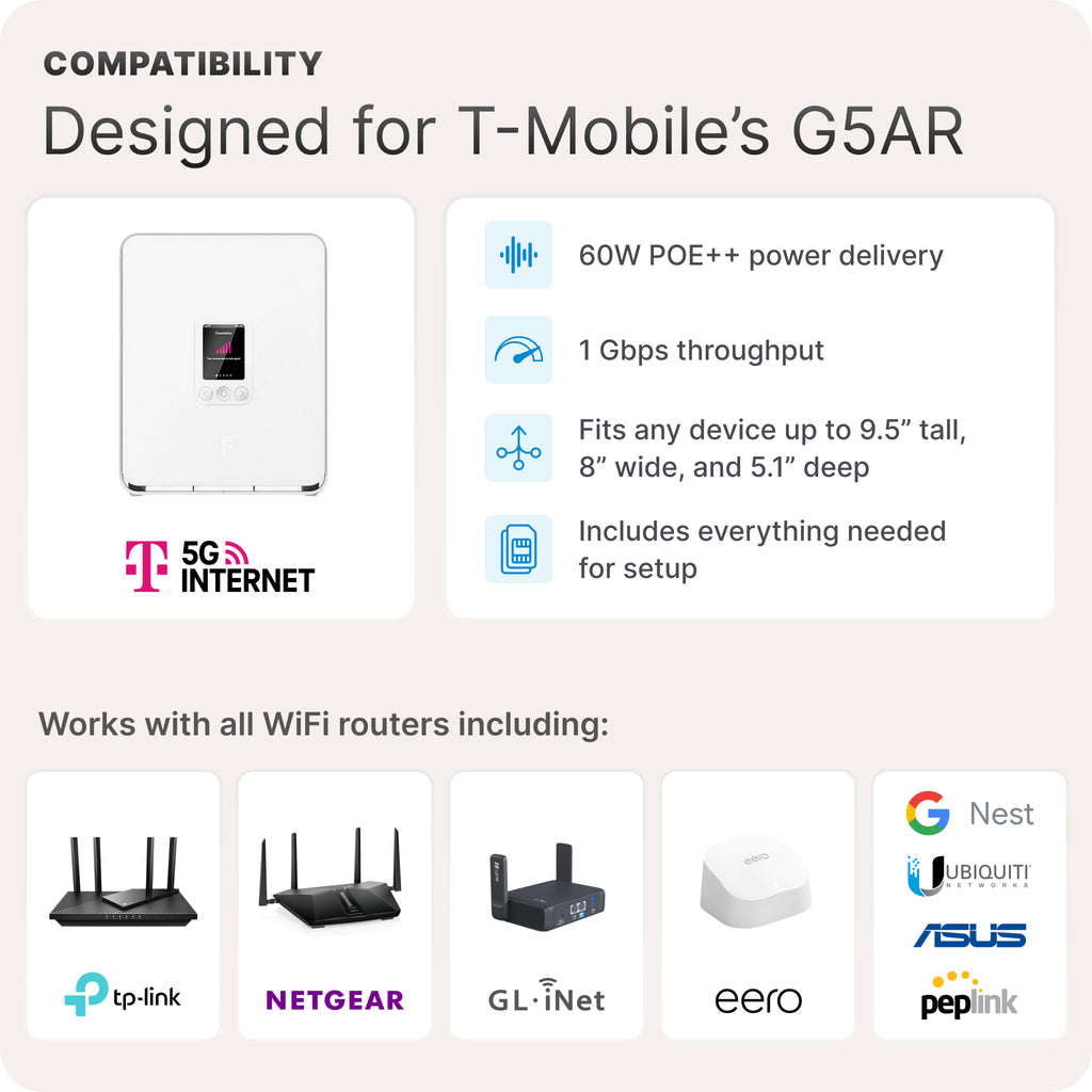 The enclosure is designed primarily for the T-Mobile G5AR and is compatible with any USB-C-powered device up to 9.5” tall, 8” wide, 5.1” deep, and drawing up to 60 W.