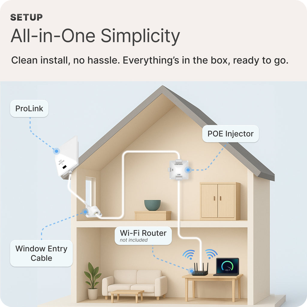 • Everything You Need For An Easy Install: ProLink is designed to plug‑and‑play with your WiFi router. Each kit includes two 50 ft outdoor‑rated Ethernet cables, a PoE injector, mounting hardware, and a window entry cable for clean, drill‑free installs. Its built‑in screen and alignment buzzer make aiming straightforward, while the Web UI provides clear signal metrics and setup tools. No coax, no extra hardware - just one outdoor unit and a single Ethernet run for a reliable, hassle‑free setup.