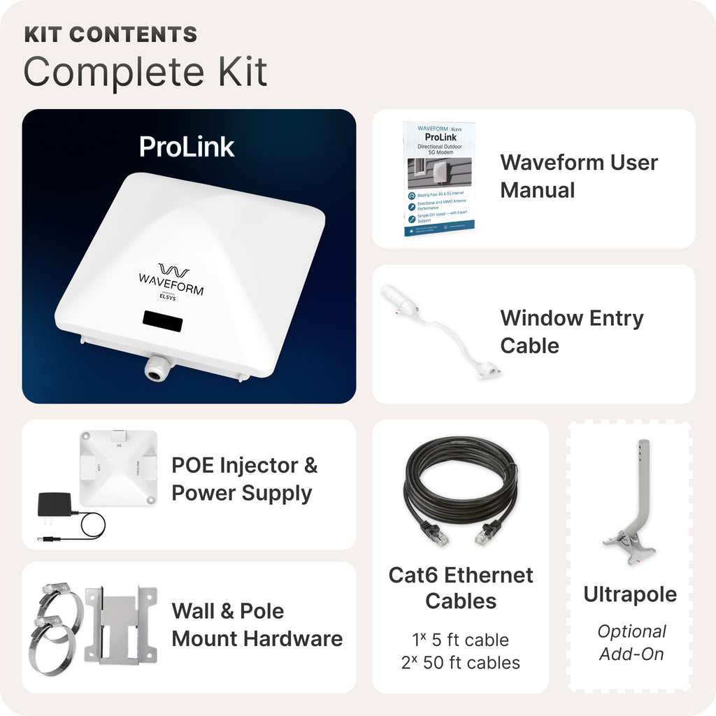 Unlock the full potential of your 5G connection with ProLink, the ultimate outdoor 5G modem for areas where signal falls short. By combining a high‑gain directional antenna, a powerful Qualcomm Snapdragon X62 modem, and a complete installation kit, ProLink eliminates signal loss, boosts reliability, and makes setup straightforward - even in the most challenging conditions.