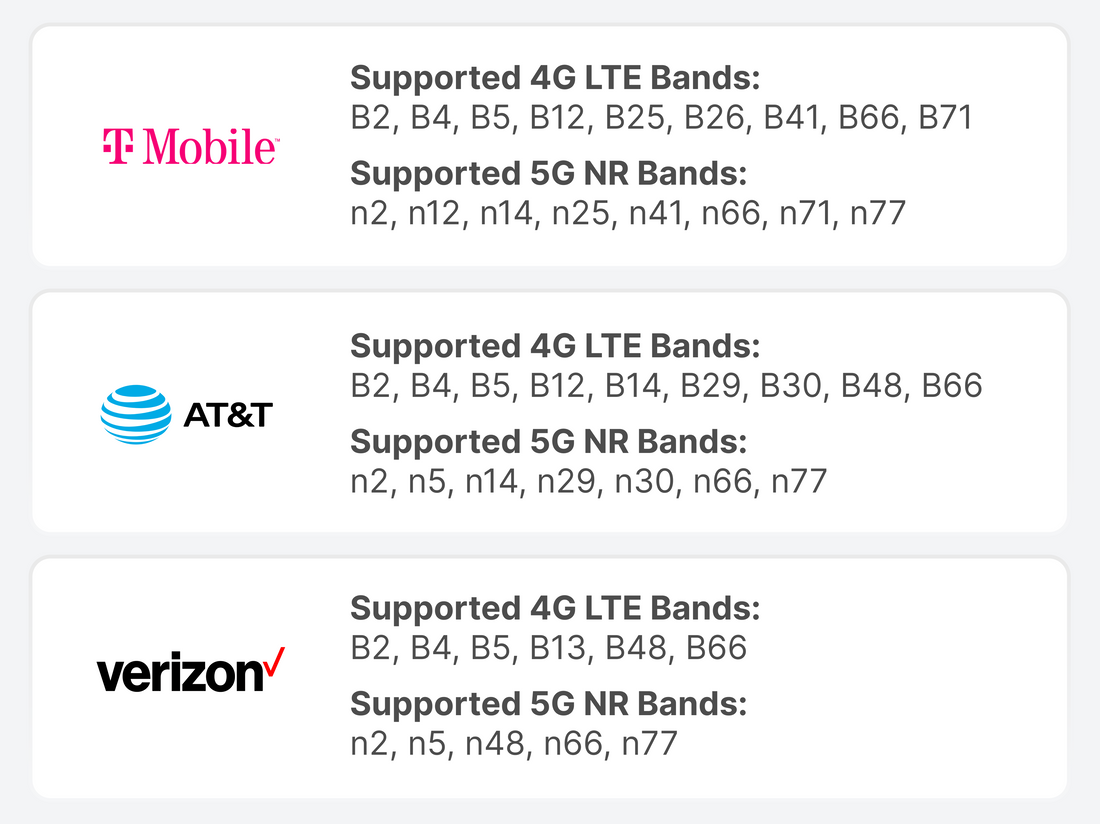 All supported 4G (LTE) Bands: B1, B2, B3, B4, B5, B7, B8, B11, B12, B13, B14, B17, B18, B19, B20, B21, B22, B25, B26, B28, B29, B30, B32, B34, B37, B38, B39, B40, B41, B42, B43, B46, B47, B48, B50, B51, B53, B65, B66, B67, B69, B70, B71, B74, B75, B76, B85, B103, B106