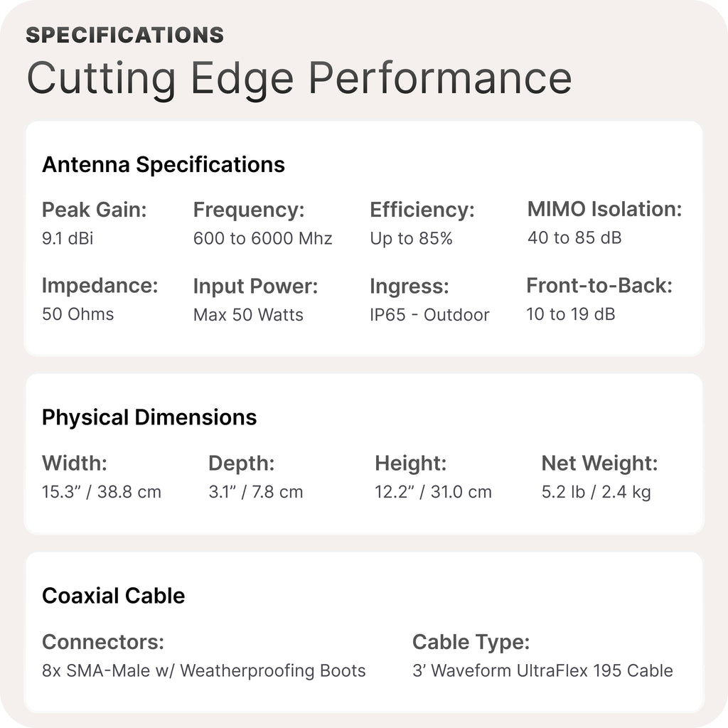 - Dual-Panel, High-Performance Design: The QuadPro Duo pairs two QuadPro antennas for full 8×8 MIMO support. Its highly directional design lets you target the nearest tower for maximum data rates, lower latency, and unbeatable reliability at the edges of coverage.